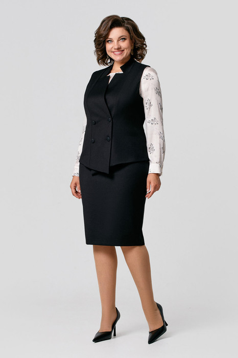 Костюм женский, состоящий из жилета, юбки и блузы. Жилет двубортный до середины бедра полуприлегающего силуэта на подкладке с горловиной V-образной формы и  фигурным вырезом застегивается на петли и пуговицы. Юбка классическая "карандаш" на подкладке с завышенной линией талии на поясе-обтачке застегивается на тесьму-молнию и имеет сзади шлицу. Юбка и жилет выпорнены из высококачественной ткани с содержанием вискозы 70%. При правильном уходе изделие прослужит долгие годы. Блуза женская свободного силуэта выполнена из легкого непросвечивающегося сатина, которая имеет втачные рукава с манжетами на пуговицах и вырез горловины округлой формы.