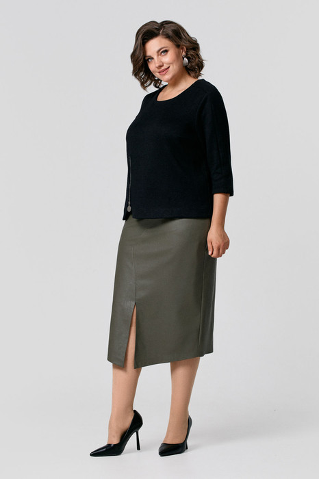 Костюм женский, состоящий из джемпера и юбки. Джемпер полуприлегающего силуэта из мягкого трикотажного полотна с добавлением ангоры со втачными немного спущенными рукавами и декоративной молнией по переду, вырез горловины округлой формы. Юбка полуприлегающего силуэта из эко - кожи, на подкладке с антистатическим эффектом, по переду функциональные карманы, по низу юбки разрез, пояс притачной, в боковые швы которого вставлена резинка для лучшего прилегания, застежка на молнию, петлю и пуговицу. Рекомендована стирка при t не выше 30 С, глажение при t прессующей поверхности не выше 110 С.