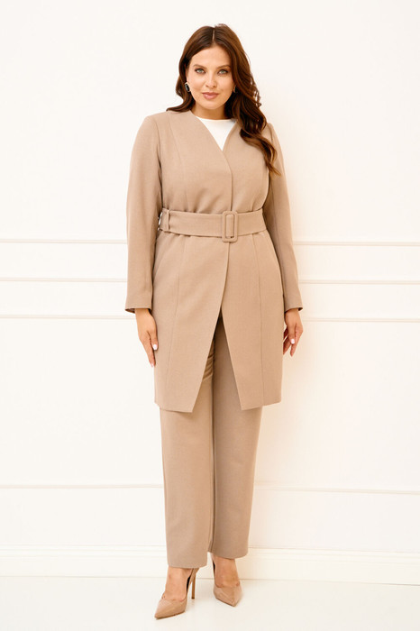 Костюм женский, состоящий из удлиненного жакета и брюк, выполнен из плотной костюмной ткани. Жакет на подкладке полуприлегающего силуэта до линии колена; рукава втачные; горловина V- образной формы; по переду рельефы и функциональные прорезные карманы; застежка на потайные пришивные кнопки. Зауженные к низу брюки  полуприлегающего силуэта застегиваются на молнию, петлю и пуговицу; пояс притачной с резинками в боковых  швах  для лучшего прилегания; на передних половинках функциональные карманы. В комплекте съемный пояс из основной ткани. Костюм полностью соответсвует заявленному размеру. Пользуйтесь таблицей замеров готового изделия.