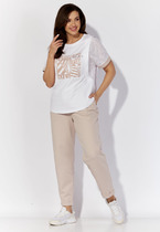 Комплект женский изготовлен из трикотажного полотна. Джемпер свободного силуэта, горловина V-образной формы обработана планкой. Перед с нагрудным карманом, декорированным вышивкой. Спинка цельнокроенная. Рукав спущенный к низу затягивается тесьмой. Низ джемпера с перепадом длины, по боковым швам разрезы. Юбка заужена к низу, пояс цельнокроенный на резинке. По переду обработан ассиметричный рельеф, в котором имеется шлица.