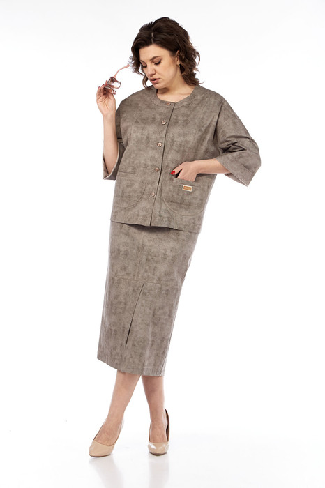 Костюм женский 2х-предметный, состоит из жакета и юбки, выполнен из хлопковой костюмной ткани. Жакет прямого силуэта, с центральной бортовой застежкой на петли и джинсовые пуговицы. Горловина округлой формы с отрезной обтачкой. По переду обработаны рельефы и накладные детали фигурной формы, в которых выполнены карманы. На спинке обработаны рельефы и кокетка. Рукава спущенные, с широкой подгибкой низа. Изделие дополнено по спинке дизайнерской вышивкой. Юбка прямого силуэта с притачным поясом, с застежкой на петлю с пуговицей и молнию. Передние и задние детали юбки разрезные. По переду обработаны боковые карманы.