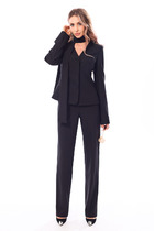 Комплект женский брючный, состоит из джемпера и брюк. Джемпер свободного кроя, изготовлен из трикотажного полотна. Горловина V-образной формы. На полочке-вышивка. Спинка цельнокроенная. Рукава спущенные, с манжетами по низу. В боковых швах-разрезы. Брюки классические из костюмной ткани. В брюках обработан пояс, частично на резинке. Застежка на молнию, петлю и пуговицу. В брюках обработаны боковые карманы. Сзади обработана кокетка.