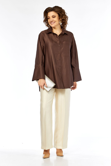 Костюм брючный двухпредметный, повседневно-нарядный, выполнен из ткани с мерцающим эффектом. Состоит из блузы и брюк. Блуза свободного силуэта. Воротник рубашечного типа, застежка центральная на петли и пуговицы. С левой стороны настрочной карман. Спинка с притачной кокеткой и встречной складкой. Рукава спущенные, по низу складки и широкая притачная манжета. Низ блузы фигурный. Брюки прямые, пояс притачной на резинке. В брюках обработаны карманы.