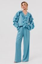 Костюм брючный двухпредметный, состоит из жакета и брюк, выполнен из ткани костюмно-плательного ассортимента. Жакет прямого силуэта. Горловина обработана воротником — стойка, застежка центрально — бортовая на петли и пробивные пуговицы. Перед с кокетками и рельефами выходящими из них. Имеются прорезные карманы с клапаном. Спинка на кокетке. Рукава рубашечного типа. Жакет дополнен печатью. Брюки свободного силуэта слегка заужены к низу. Пояс притачной, частично на эластичной тесьме, с застежкой на петлю и пробивную пуговицу. По переду обработаны карманы с листочкой и подрезным бочком. Вдоль швов костюма проходят контрастные строчки из отделочных ниток.