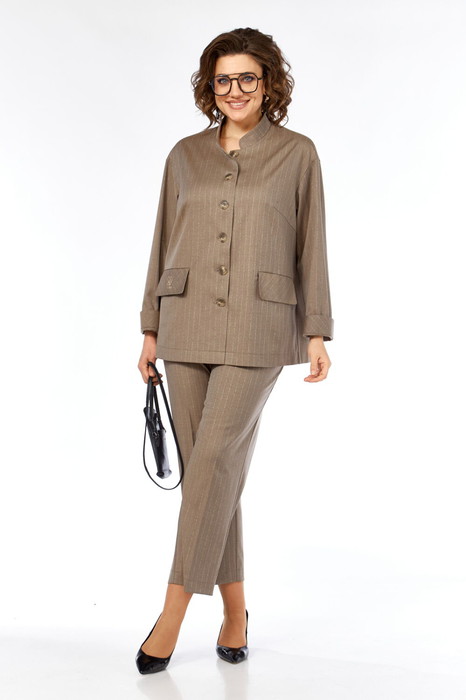 "Костюм женский двухпредметный, состоит из жакета и брюк, выполнен из костюмной ткани в полоску. Жакет прямого силуэта. Горловина обработана воротником-стойкой, застежка центрально-бортовая на петли и пуговицы. По переду обработаны нагрудные вытачки и прорезные карманы с клапаном. Спинка с притачной кокеткой. Рукава длинные, линия плеча немного спущена. Брюки свободного силуэта с притачным поясом, частично на эластичной тесьме и застежкой на петлю и пуговицу. По передним деталям брюк обработаны карманы с планкой. Костюм дополнен дизайнерской вышивкой на клапане жакета.