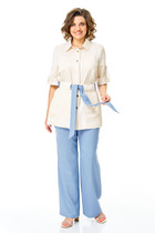 Костюм брючный, двухпредметный, состоит из блузы и брюк. Блузка свободного силуэта. По переду горловина V-образной формы с двумя планками и завязками. Спинка со встречной складкой. Рукава комбинированные: по переду — реглан, дополнены кружевной тесьмой, по спинке рукава цельнокроенные. Низ рукавов фигурной формы. В боковых швах обработаны разрезы. Низ изделия с перепадом длинны. Блузка дополнена вышивкой . Брюки прямого силуэта, с притачным поясом на эластичной тесьме. По передним деталям брюк обработаны карманы с подрезным бочком.