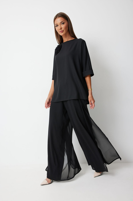 Блуза женская прямого силуэта закрывающая линию паха  с цельнокроеными рукавами. К блузке прилагается съёмный декор – цветок. По боковым швам располагаются разрезы. Спинка с центральным швом и застежкой на навесную петлю и пуговицу. Горловина обработана косой бейкой. Рукав до локтя, низ рукава  обработан отрезной отворачивающейся манжетой, закрепленной по швам. Низ блузки обработан швом «в подгибку».