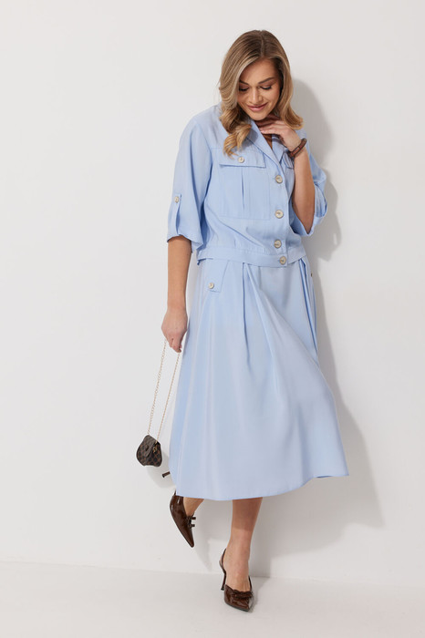 Костюм женский, состоящий из жакета и юбки. Жакет прямого силуэта без подкладки, длиной до линии бедра. По переду жакета настрочены накладные карманы с встречными складками. В шве притачивания кокетки расположен клапан кармана, застегивающийся на петлю и пуговицу. В среднем шве спинки расположена встречная складка. Рукав втачной одношовный, прямой. По низу рукава расположена пата, застегивающаяся на петлю и пуговицу. По низу жакета обработан отрезной пояс. Горловина обработана втачным воротником с лацканами. Застежка центральная , однобортная на петли пуговицы. Юбка женская на подкладке А – силуэта длиной до середины икры. По переду юбки заложены встречные складки и нстрочены клапаны с декоративными пуговицами. Спинка юбки цельная. Карманы обработаны в боковом шве юбки. По левому боковому шву юбки находится застежка – молния. Верхний срез юбки обработан притачным поясом с резинкой по спинке.