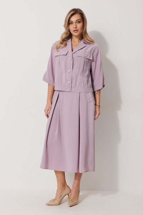 Костюм женский, состоящий из жакета и юбки. Жакет прямого силуэта без подкладки, длиной до линии бедра. По переду жакета настрочены накладные карманы с встречными складками. В шве притачивания кокетки расположен клапан кармана, застегивающийся на петлю и пуговицу. В среднем шве спинки расположена встречная складка. Рукав втачной одношовный, прямой. По низу рукава расположена пата, застегивающаяся на петлю и пуговицу. По низу жакета обработан отрезной пояс. Горловина обработана втачным воротником с лацканами. Застежка центральная , однобортная на петли пуговицы. Юбка женская на подкладке А – силуэта длиной до середины икры. По переду юбки заложены встречные складки и нстрочены клапаны с декоративными пуговицами. Спинка юбки цельная. Карманы обработаны в боковом шве юбки. По левому боковому шву юбки находится застежка – молния. Верхний срез юбки обработан притачным поясом с резинкой по спинке.
