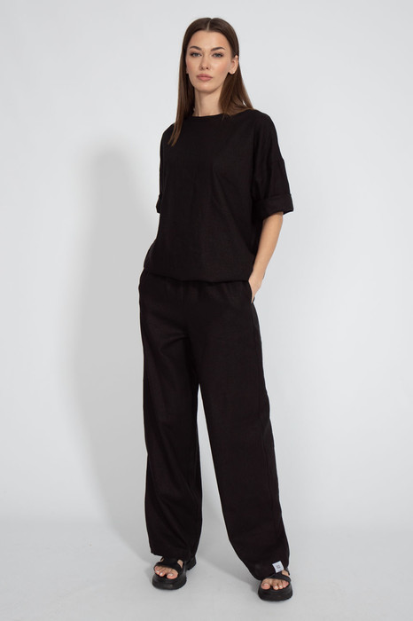 Костюм состоящий из брюк прямого свободного кроя с карманами в боковых швах и джемпера свободного кроя. С приспущенным рукавом и кулиской по низу изделия с возможностью регулировки ширины низа. Ткань лен. Отлично сочетается с шортами модели 4074, рубашкой 4073, рубашкой 4081, джоггерами 4082.