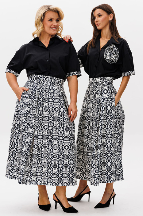 Костюм из двух элементов: блуза свободного кроя с декоративным цветком + хлопковая юбка с встречными складками — идеальный гармоничный ансамбль, сочетающий женственность, комфорт и актуальный дизайн.