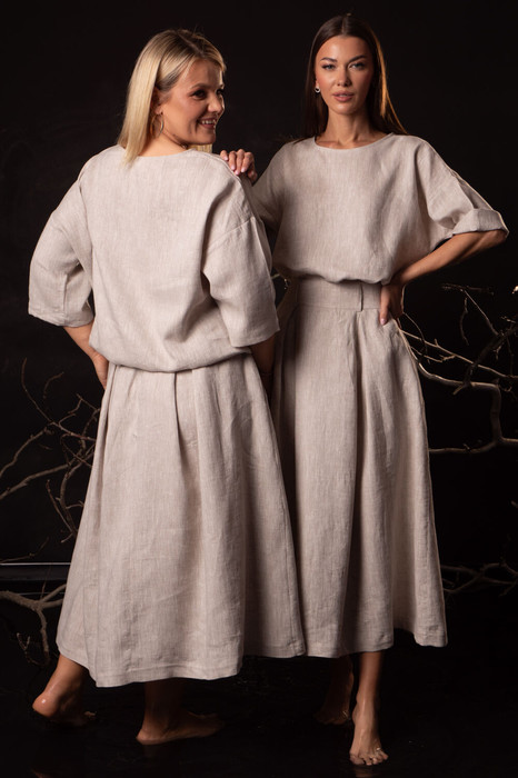 Элегантный костюм премиум-класса из белорусского льна с вискозой премиального качества — идеальный баланс романтики, практичности и экологичности. Набор включает джемпер свободного прямого кроя со съемным декоративным бантом и длинную юбку с эффектными встречными складками, боковыми карманами и потайной молнией. Натуральные материалы обеспечивают легкость, воздухопроницаемость и гипоаллергенность, сохраняя безупречный вид в любых ситуациях.