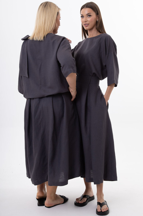 Элегантный костюм премиум-класса из белорусского льна с вискозой премиального качества — идеальный баланс романтики, практичности и экологичности. Набор включает джемпер свободного прямого кроя со съемным декоративным бантом и длинную юбку с эффектными встречными складками, боковыми карманами и потайной молнией. Натуральные материалы обеспечивают легкость, воздухопроницаемость и гипоаллергенность, сохраняя безупречный вид в любых ситуациях.