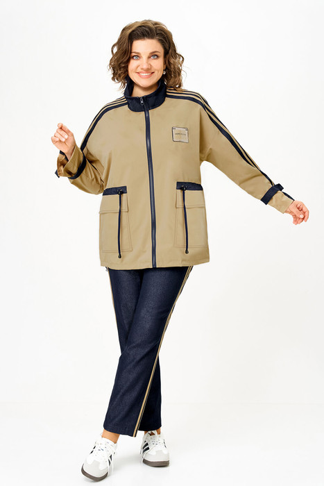 Комбинированный брючный премиум комплект в стиле спорт шик для внесезонной носки. Удлиненная куртка-ветровка без подкладки, по талии с кулисой, свободного силуэта на молнии, с накладными карманами, воротник - высокая отложная стойка, по рукаву контрастная отделка и регулируемый хлястик . Спинка с кокеткой. Брюки средней посадки, заужены к низу с декоративными лампасами , без застежки , на круговой резинке по талии, с карманами в боковых швах.