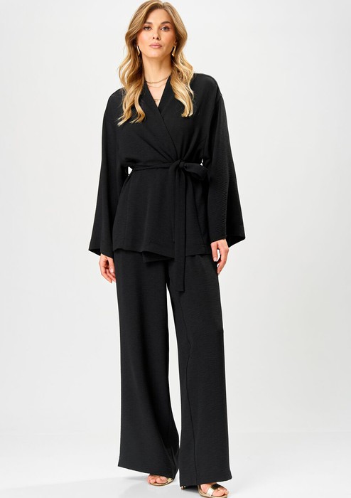 Жакет женский из мягкой костюмно-плательной ткани с креш-эффектом, свободного силуэта, длиной ниже линии бедер, со спущенной линией плеча, с втачными рукавами, в боковых швах обработаны разрезы, со съемным поясом. Детали переда жакета с отрезными бочками. Деталь спинки жакета с втачной стойкой, переходящей на перед. Рукава втачные одношовные, широкие. По боковым швам на уровне линии талии прикреплены шлевки для протяжки съемного пояса.