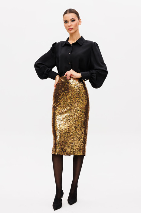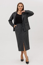 Юбка на подкладке прямого силуэта, чуть зауженная к низу. В среднем шве размещена потайная молния и открытый разрез. На линии талии размещены классические вытачки. Пояс внутренний, обтачной. Длина юбки по боковому шву 68-70 см. Высота разреза 21 см.