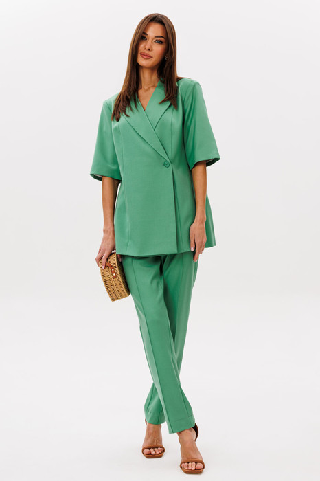 Актуальный гармоничный комплект, состоящий из двубортного жакета с укороченным рукавом и прямых чуть зауженных брюк с фигурным поясом.
