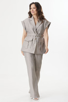 Стильный гармоничный комплект в стиле умеренного оверсайза, состоящий из свободного жакета и широких брюк. Эффектной деталью комплекта выступает высокая открытая шлица на спинке жакета, закрепленная пуговицами.