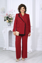 Брюки комплекта созданы в свободном стиле из джинсовой ткани. Силуэт брюк к низу изделия имеет расклешение. В пояс брюк по спинке вставлена эластичная тесьма, шириной 3 см. Спереди пояс фиксируется горизонтально на петли/пуговицы и вертикальную закрытую клапан-молнию (гульфик). При желании в пояс можно вставить ремень, так как имеются шлевочные держатели. В боковых швах: карманы с наклонным входом, на поясной линии талии переда расположена неглубокая складка для свободы движения, на задних полотнищах линии талии: вытачки, также на задних полотнищах расположены накладные карманы. Длина брюк по боковому шву 108 см (без учета высоты пояса). По основным линиям изделия проложена декоративная строчка контрастного охрового тона.