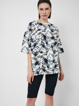 Блузон, прямого свободного силуэта, со спущенной линией плеча, рукавом 7/8 с отворотом. Спинка состоит из горизонтальной кокетки, среднего шва, в котором расположена открытая шлица. На полочке блузона, на уровне ниже талии, расположены накладные карманы с отворотом-клапаном. Застежка фронтальная, петли/пуговицы.