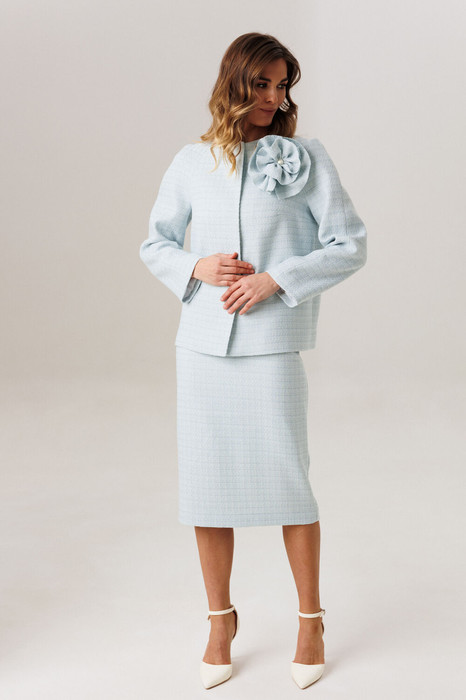 Эффектный комплект из фактурной ткани в стиле Одри Хепберн, состоящий из жакета, юбки и текстильного съемного украшения в виде цветка.