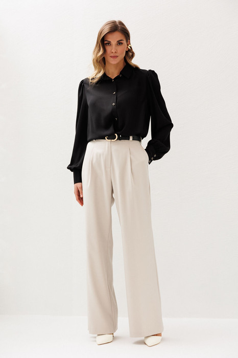 Блуза прямого свободного силуэта с рубашечным воротником на стойке. Рукав втачной, с легкой сборкой по окату и линией втачивания в манжет. Высота манжета 8 см. Длина рукава 65 см (без учета напуска на манжет). Спереди расположена вертикальная планка, на которой расположена функциональная застежка на петли/пуговицы. В боковых швах: разрезы, высотой 15 см. Длина изделия по спинке 72 см.