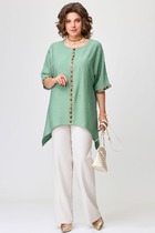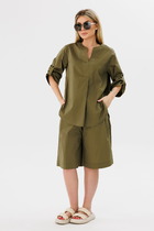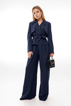 Стильный комплект, состоящий из блузона и юбки, из костюмной ткани. Блузон прилегающего силуэта, слегка расклешён к низу. Спинка со средним швом. В среднем шве спинки – потайная застёжка-молния. Длина по спинке – 56,5 см. Горловина обработана стойкой – воронкой, высотой- 3,5 см. Рукав – реглан, слегка расклешён к низу. Длина рукава – 41,5 см. Юбка прилегающего силуэта, зауженная к низу, по среднему шву – потайная застёжка на тесьму – молнию, в низу – разрез. Верхний край обработан обтачкой. Длина юбки по боковому шву – 64 см. Юбка на подкладке. Декор – ремень, может отличаться от заявленного на фото.