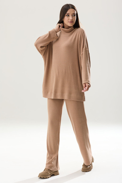 Комплект из уютного мягкого трикотажа, состоящий из свободного покроя, джемпера оверсайз и широких свободных брюк. Джемпер имеет спущенную линию плеча, свободный рукав, зауженный к низу. Ширина рукава 22-24 см, запястья 15 см. Длина от линии горловины до запястья 72-74см (в зависимости от размерного ряда). Боковые швы джемпера дополнены разрезами, высотой 15 см. Длина изделия по линии спинки 72.5-74 см (в зависимости от размерного ряда). Горловина джемпера оформлена стойкой с перегибом, высотой 8 см.