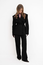 Комплект, состоящий из жакета и юбки. Жакет полуприлегающего силуэта на подкладке с рельефами по переду и спинке, с отрезным поясом по талии и накладными карманами с клапаном. Рукав втачной двухшовный длинный, воротник стояче-отложной. Застежка центральная бортовая на обтяжные пуговицы. Юбка на подкладке, зауженная к низу с притачным поясом и на резинке в размерах 50-60. Застежка в юбке на потайную тесьму-молнию в среднем шве заднего полотнища и шлицей.