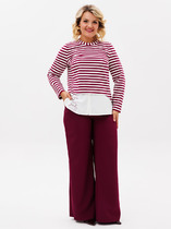 Комплект состоит из корсета, блузки и брюк. Корсет со шнуровкой по спинке. По рельефам спинки и переда вставлена регилиновая тесьма для сохранения формы. Особенностью корсета является пояс притачной по переду и отлетной по спинке. Брюки прямого свободного покроя на притачном поясе. Застежка на тесьму-молнию и пуговицу. По передним половинкам брюк функциональные карманы-хулиганы и складки. В пояс задней части брюк вставлена резинка. Блузка прямого силуэта со спущенной линией плеча. Рукав втачной, одношовный, длинный с притачной манжетой с разрезом. Воротник рубашечный с отрезной стойкой. Застежка на потайную планку на петли и пуговицы. По боковому шву разрезы.