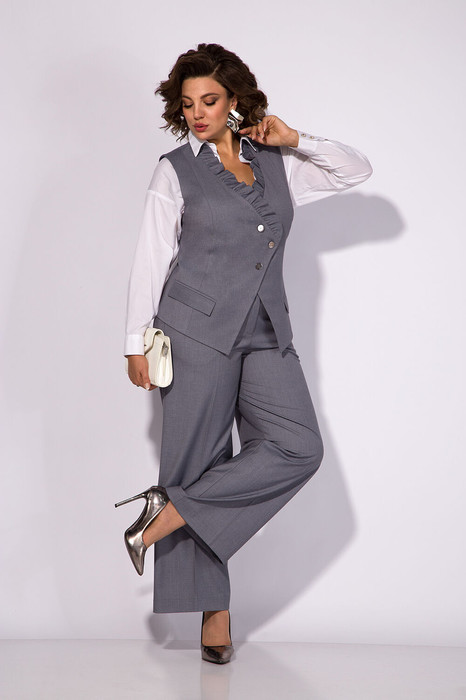 Эффектный офисный костюм, состоящий из брюк и жилетки. Оригинальная жилетка на шелковой подкладке, с ассиметричной застежкой на пуговицы. Вырез горловины v-образной формы с рюшей из основной ткани. Жилетка с прорезными карманами с клапаном. Спинка приталенная. Брюки прямого кроя, на притачном поясе. Застежка - брючная тесьма-молния с обработанным гульфиком. В боковых участках пояса вставлена резинка для более комфортного прилегания. В брюках заутюжены канты. Такой костюм можно носить в комплекте или раздельно, дополнить блузкой для деловой встречи или футболкой для модной вечеринки. В таком костюме вы всегда будете чувствовать себя превосходно!