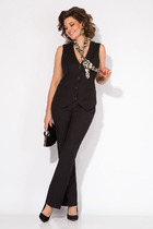 Жилетка полупрниталенного силуэта, с застежкой на пуговицы выполнена из костюмной ткани. По полочке расположены продольные рельефы с прорезными карманами. Спинка выполнена из шелкового сатина с эффектным принтом. Есть хлястик для приталивания. Жилетка на шелковой подкладке. Брюки в костюме со средней посадкой на притачном поясе-кокетке со вставками из отделочной ткани. Застежка – потайная тесьма-молния. По спинке имеется резинка. Брюки слегка заужены в области колена. Строгость и утонченность - основные характеристики женской костюмной двойки.