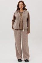 Жакет прямого силуэта. Воротник пиджачного типа. Передние половинки жакета с нагрудными вытачками и центральной застёжкой на петли и пуговицы. В боковых швах небольшие разрезы. Рукав втачной одно-шовный. Брюки свободного кроя, прямые. Передние половинки брюк с двумя складками по переду и застёжкой по типу «гульфик». Верхний срез брюк обработан притачным поясом, по бокам вставлена резинка. В боковых швах карманы «хулиганы».