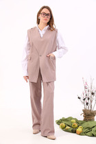 Комплект женский 3-х предметный: жилет, брюки и блуза. Жилет полуприталенного силуэта с центральной бортовой застежкой на петлю и пуговицу. Воротник пиджачного типа с отложными лацканами. По переду жилета рельефы. На бочках переда функциональные карманы с листочкой. Спинка с центральным швом и рельефами. Жилет на подкладке. Блузка с округлой формой горловины, рукав втачной, низ рукава на притачной манжете с застёжкой на петли и пуговицу. Брюки заужены к низу. Верхний срез брюк на притачном поясе на резинке с тесьмой из основной ткани.