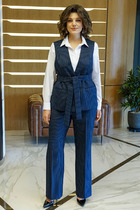 Юбка на подкладке, заужена к низу, по заднему полотнищу шлица. Застежка сзади на потайную молнию и пуговицу. По бокам в поясе вставлена резинка.