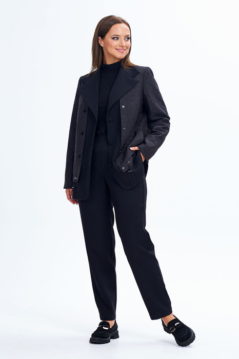 Комплект изготовлен из двух видов тканей. Жакет слегка приталенного силуэта с центральной бортовой застежкой на 3 петли и пуговицы. Воротник пиджачного типа с отложными лацканами. По переду обработаны прорезные карманы с листочкой. Рукава втачные двухшовные. Жакет на подкладке. Брюки к низу заужены, верхний срез брюк на притачном поясе, от середины передних половинок и по спинке вставлена резинка. По переду брюк имитация гульфика, по бокам карманы с наклонным входом.