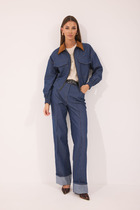 Комплект изготовлен из двух видов тканей. Жакет слегка приталенного силуэта с центральной бортовой застежкой на 3 петли и пуговицы. Воротник пиджачного типа с отложными лацканами. По переду обработаны прорезные карманы с листочкой. Рукава втачные двухшовные. Жакет на подкладке. Брюки к низу заужены, верхний срез брюк на притачном поясе, от середины передних половинок и по спинке вставлена резинка. По переду брюк имитация гульфика, по бокам карманы с наклонным входом.