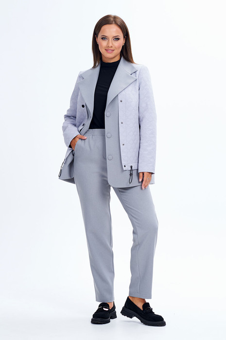Комплект изготовлен из двух видов тканей. Жакет слегка приталенного силуэта с центральной бортовой застежкой на 3 петли и пуговицы. Воротник пиджачного типа с отложными лацканами. По переду обработаны прорезные карманы с листочкой. Рукава втачные двухшовные. Жакет на подкладке. Брюки к низу заужены, верхний срез брюк на притачном поясе, от середины передних половинок и по спинке вставлена резинка. По переду брюк имитация гульфика, по бокам карманы с наклонным входом.