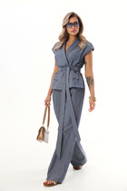 Жакет длинной чуть ниже линии талии. Воротник стояче отложной, рукав втачной двух-шовный, низ рукава на притачной манжете. Центральная застёжка на петли и пуговицы. Низ жакета на притачном поясе. Юбка длиной миди. По переду и спинке отрезная кокетка. На нижней части юбки по шву притачивания кокетки заложены односторонние складки. Верх юбки на притачном поясе со шлёвками, по бокам вставлена эластичная тесьма. В боковых швах карманы. Застёжка центральная на петли и пуговицы.