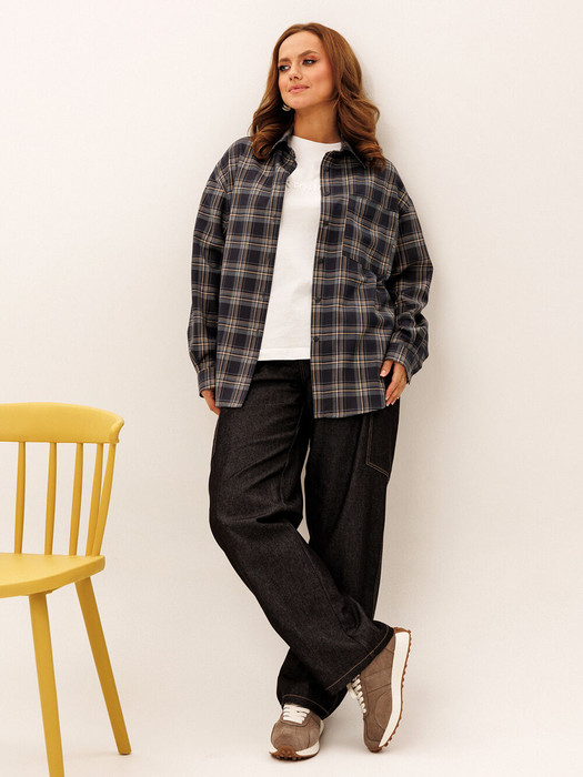 Рубашка прямого силуэта со спущенной линией плеча.  Центральная застежка на петли и пуговицы. Воротник с отрезной стойкой.  На левой полочке переда накладной карман. Рукав одно шовный с притачной манжетой. По шву притачивания манжеты рукав закладывается в две складки. Застежка рукава на одну петлю и пуговицу Низ рубашки фигурный.
