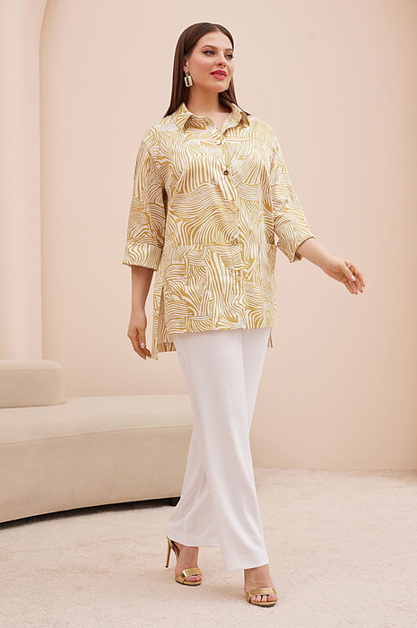 Рубашка прямого силуэта  свободного кроя с центральной застежкой и настрочными карманами выполнена из гладкой х/б ткани с матовым блеском и актуальным принтом . Стильный акцент на золотые пуговицы завершает весь образ. Спинка  удлиненная с горизонтальной кокеткой и встречной складкой, по бокам разрезы. Линия плеча приспущена, рукав с отложной манжетой с отворотом.