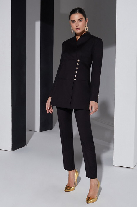 Дизайнерский брючный костюм со смещенной застежкой отличный выбор для ценителей минимализма и строгого стиля. Универсальный комплект впишется в любой гардероб и подойдет на все случаи жизни, подходит для шпилек и обуви на плоском ходу. Вещи из этой капсулы легко сочетать с другими вещами, базовые черные брюки отлично будут смотреться с белой рубашкой, а удлиненный жакет можно носить как легкий плащ с платьем или юбкой. Удлиненный жакет с цельнокроеной стойкой и смещенной застежкой, застегивается на воздушные навесные петли. Перед и спинка с подрезами ниже груди и талии оформлены декоративными отстрочками. Рукав втачной с отлетной шлицей.  Базовые брюки  с косыми карманами заужены к низу. Застежка обработана по классической   технологии  (гульфик с молнией и пуговица на поясе).  Вся обработка выполнена как в классических итальянских костюмах. Жакет на подкладке. На обтачке спинки жакета выполнена аккуратная вышивка.