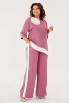 Комплект 2ка, состоящий из джемпера и брюк. Джемпер свободного объёма, оригинального кроя, с имитацией топа и открытыми плечами. Горловина круглая, по спинке застежка на петлю и пуговицу Отделка горловины джемпера и манжеты выполнены из довязов в контрастном цвете.  Брюки широкого объема, прямого силуэта. На передних половинках брюк заутюжены стрелки, переходящие в складки по линии талии. На задних половинках также заутюжены стрелки. В боковых швах расположены карманы. Застежка-гульфик. Пояс отрезной, притачной. В задней части пояса вставлена эластичная тесьма (резинка). На пояс настрочены шлевки. Выступающая часть пояса застегивается на петлю и крючок. Рост модели 170, размер 48.                    СОВЕТ ОТ СТИЛИСТА: из обуви отлично подойдут лодочки. Для образа "выходного дня" сделайте выбор в пользу кроссовок или кед.