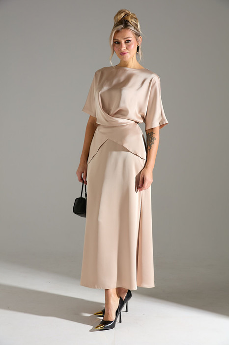 Костюм 2ка из лёгкой струящейся ткани с атласным благородным блеском, состоящий из блузки и юбки. Блузка свободного объёма, по переду имитация застежки на запАх. В комплекте шнур из основной ткани, которым можно приталить блузу, обвязав по кругу, или продеть через боковые швы и завязать по спинке. Юбка широкого объёма, длины "миди".