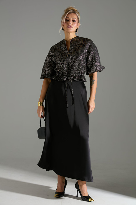 Комплект 2-ка, состоящий из жакета и юбки. Жакет с застёжкой на молнию и объёмными рукавами. Линия талии на кулисе и завязке из основной ткани. Юбка кроя трапеция, длина макси.