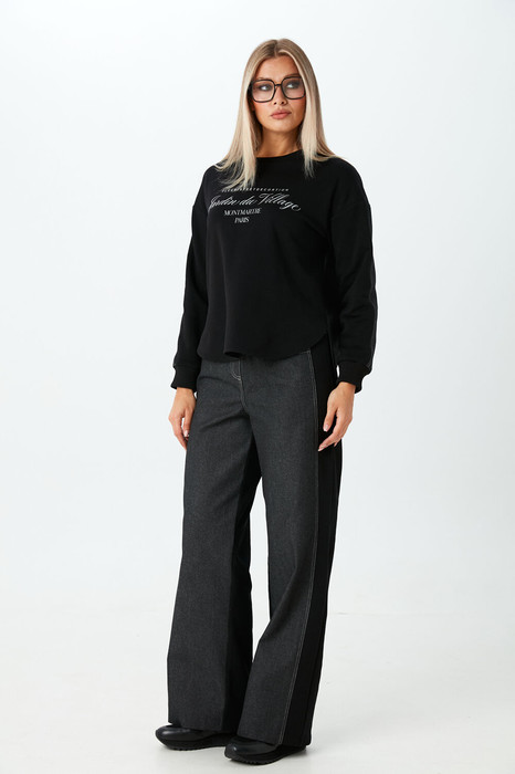 Комплект 2ка, состоящий из джемпера и брюк. Комплект выполнен из ткани двух видов. Джемпер объёмного кроя со светоотражающим принтом по переду (эффект виден в темноте). Спинка удлинённая, выполнена по принципу рубашки с кокеткой, по низу рукавов манжеты из довязов. Брюки свободного кроя от бедра. Талия брюк на резинке, по переду и сзади расположены карманы.
