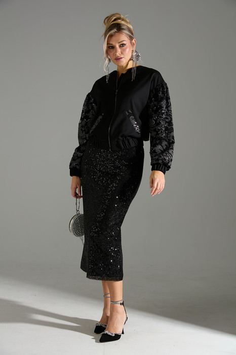 Комплект 2ка, состоящий из бомбера и юбки. Бомбер свободного силуэта с объёмными рукавами и застёжкой на молнию. Манжеты и низ бомбера на резинке. Карманы и рукава бомбера декорированы кружевной тканью расшитой пайетками. Юбка- карандаш длиной ниже колена прямого силуэта. Пояс юбки и подкладка выполнены из эластичного  трикотажа.  Верхний слой юбки из лёгкой ткани расшитой пайетками. Застёжка на потайную молнию в среднем шве по спинке, разрез расположен внизу среднего шва.