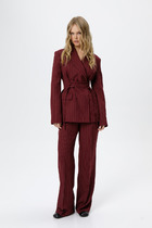 Комплект 2-ка, состоящий из рубашка и брюк. Рубашка женская большого объема, прямого силуэта. На детали спинки расположена двойная кокетка, переходящая на деталь полочки. Под кокеткой на спинке встречная складка. Воротник рубашечный отложной на стойке. Застежка планка центральная на прорезные петли и пуговицы. Линия плеча спущенная, рукав рубашечный, длинный. В нижней части рукава заложены складки, заканчивается манжетой с двумя прорезными петлями и пуговицами. Низ блузки разноуровневый: спереди короче, сзади длиннее. Широкие брюки-кюлоты свободного оригинального кроя с застёжкой на пуговицы. Без карманов.