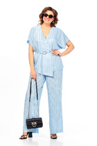 Комплект 2ка состоит из рубашки и брюк. Брюки из джинсовой ткани свободного объёма от бедра с застёжкой на молнию и пуговицу. По переду и сзади расположены карманы. Рубашка женская большого объема, прямого силуэта. На детали спинки расположена двойная кокетка, переходящая на деталь полочки. Под кокеткой на спинке встречная складка. Воротник рубашечный отложной на стойке. Застежка планка центральная на прорезные петли и пуговицы. Линия плеча спущенная, рукав рубашечный, длинный. В нижней части рукава заложены складки, заканчивается манжетой с двумя прорезными петлями и пуговицами. Низ блузки разноуровневый: спереди короче, сзади длиннее.