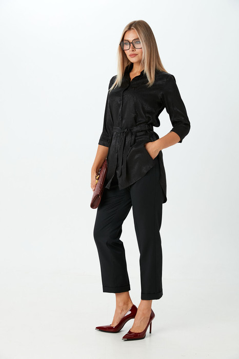 Комплект 2ка, состоящий из блузки и брюк. Удлинённая блузка с застёжкой на пуговицы,воротник рубашечного типа,рукава 3/4. В комплекте пояс из основной ткани. Зауженные брюки с подворотами по низу. Пояс на эластичной тесьме с кулисой и втянутым шнурком. Вход в карман фигурный, наклонный к боковому шву.